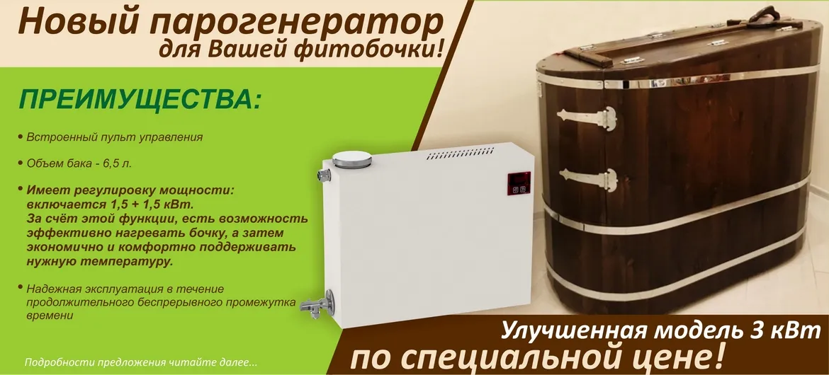 Работа Вашей фитобочки станет беспрерывной, комфортной, более экономичной только с улучшенным парогенератором 3 кВт!