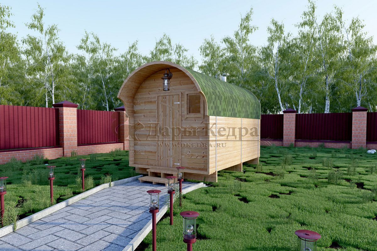 Баня-бочка буханка из кедра с козырьком (все размеры) Баня-буханка более просторная за счет увеличенной высоты потолков и ровного пола. Козырек не только украшает баню, но и защищает оставленную обувь от дождя. Лавочки из кедра находятся по всей длине бани-бочки с обеих сторон. Печь расположена в парилке около дальней стены. Время растопки такой бани не превышает 30 минут. В зависимости от выбранного размера баня-бочка буханка с козырьком имеет следующую комплектацию: Баня-бочка буханка 2,5 метра - парилка; Баня-бочка буханка 3,5 и 4,5 метра - раздевалка, парилка; Баня-бочка буханка 5,5 метров - раздевалка, парилка, моечная. По вашему желанию ее можно укомплектовать печью с внешней загрузкой, благодаря которой весь мусор вовремя топки остается на улице. Баня-бочка буханка не требует полноценный фундамент, поэтому при необходимости ее можно перенести в другое место. Обращаем Ваше внимание, что в стандартную комплектацию бани входят полки открытого типа в парной с обеих сторон. Дополнительно можно заказать полок закрытого типа или лавку! Кедр обладает ароматическими свойствами. Он не деформируется и влагоустойчив, при правильном уходе за деревом на нем не развиваются грибки и плесень.