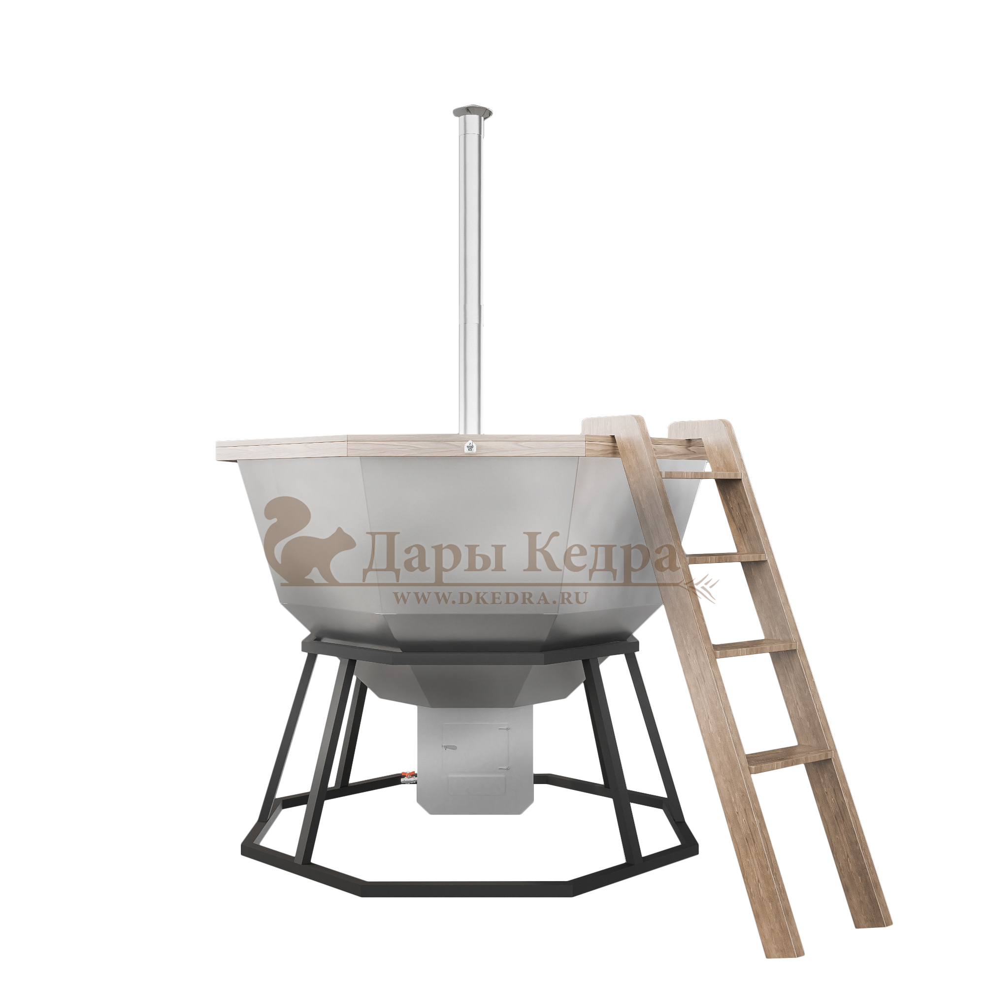 Банный чан из нержавеющей стали Ø-2350 на подставке с приставной печью Банный чан с приставной печкой изготовлен из пищевой стали. Представляет собой большую ёмкость в виде чаши, при нагревании которой можно париться на свежем воздухе. Чан установлен на устойчивую металлическую подставку и оснащен приставной печью с дымоходом. Банный чан оборудован кедровым бортом, скамейками, подспинниками, трапом для ног и приставной лестницей.