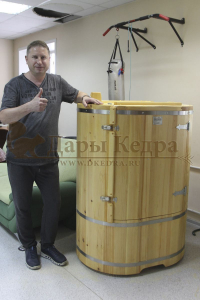 Готовый комплект - это полностью укомплектованный набор с фитобочкой для процедур парения. Овальная модель более просторна и удобна в использовании. Толщина стенок составляет 25 мм. Фитобочка оборудована откидными створками, дверцей и отверстием для головы. Во время парения человек сидит внутри кедровой бочки, а голова находится снаружи. Благодаря этому исключается возможность перегрева. Подлокотники из кедра, встроенные ручки на створках и двери делают эксплуатацию более удобной.