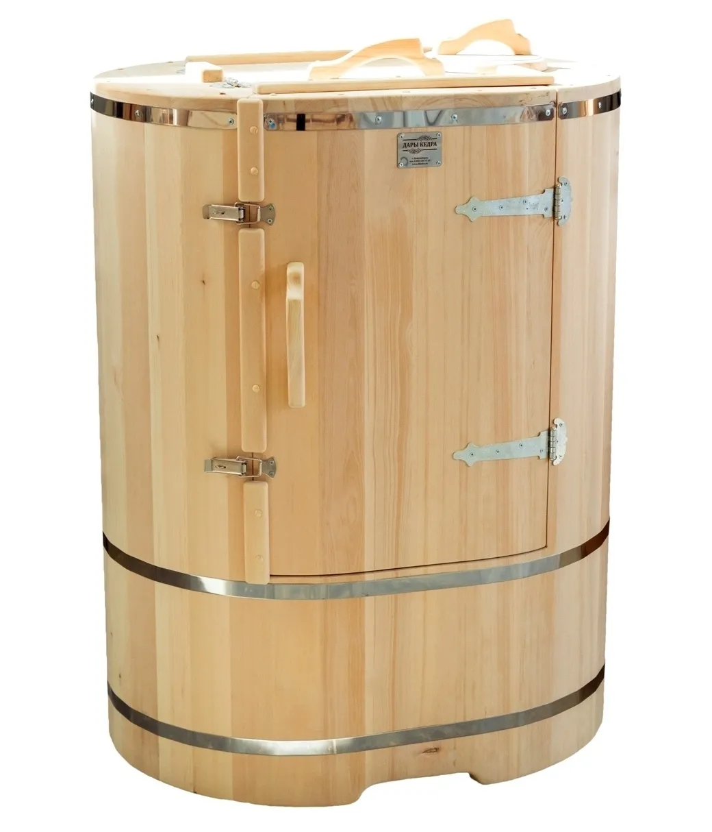 Кедровая бочка (фитобочка) овальная «Классическая» Овальная фитобочка из кедра - это мини парная, которую можно использовать не только в спа-салонах, но и дома. Овальная модель более просторна и удобна в использовании. Толщина стенок составляет 25 мм. Она оборудована откидными створками, дверцей и отверстием для головы. Во время парения человек сидит внутри кедровой бочки, а голова находится снаружи. Благодаря этому исключается возможность перегрева. Подлокотники из кедра, встроенные ручки на створках и двери делают эксплуатацию более удобной. Парение в фитобочке благотворно влияет на организм в целом: повышается иммунитет, выводятся шлаки и токсины, улучшается работа органов тела и состояние кожи.