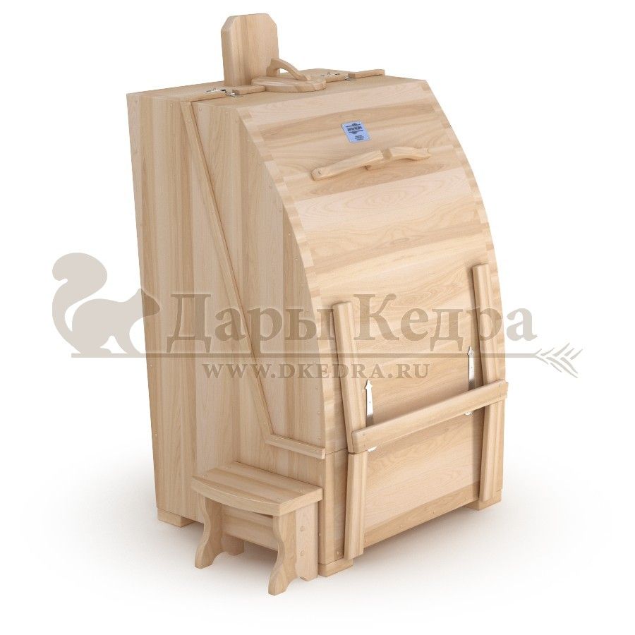 Кедровая бочка (фитобочка) полулежачая «Классическая» Кедровая фитобочка полулежачая - это мини парная, которую можно использовать не только в спа-салонах, но и дома. Модель этой бочки наиболее комфортна, так как позволяет принимать процедуры полулежа. Толщина стенок составляет 25 мм. Фитобочка оборудована откидными створками, дверцей и отверстием для головы. Во время парения человек находится внутри кедровой бочки, а голова снаружи. Благодаря этому исключается возможность перегрева. Подлокотники, подспинник из кедра и внутренние ручки делают эксплуатацию фитобочки более удобной. Парение в фитобочке благотворно влияет на организм в целом: повышается иммунитет, выводятся шлаки и токсины, улучшается работа органов тела и состояние кожи.