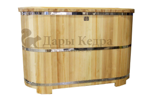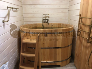Это герметичная емкость для воды из кедра, которая используется для отдыха и охлаждения тела после процедур парения. Купель оснащена лавочками, приставной и внутренней лестницей из кедра. За счет стяжных болтов обручи из нержавеющей стали плотно прилегают к кедровой купели. Это позволяет равномерно распределять нагрузку воды и сохранить форму изделия в период эксплуатации. При правильном уходе купель для бани не рассыхается и не подвергается гниению. Овальная купель подходит для уличного и комнатного использования.