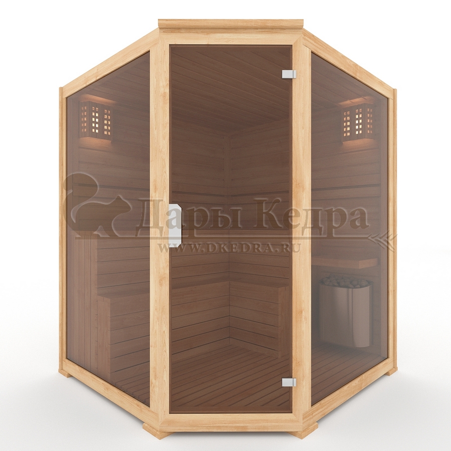• Трехместная угловая финская «Элит» сауна кабина из кедра и липы с электрокаменкой Это специально оборудованная готовая деревянная кабина для сухого и влажного парения. Электропечь нагревает пространство внутри и позволяет сбрызгивать камни водой, слегка увлажняя воздух. Такая процедура позволяет избежать перегрева. Каркас сауны выполнен из массива кедра, снаружи и внутри обшит липовой вагонкой сорта «Экстра» и имеет теплоизоляционный слой. Также двухуровневый полок идёт из кедра для обогащения внутри кабины полезными фитонцидами, а в сочетании с противовирусными свойствами липы сауна становится настоящим источником здоровья. Закаленный цельностеклянный фасад с безрамной дверью является термостойким и придает конструкции легкость и обзорность. Можно добавить боковую стенку, как на образце 3D модели из термостекла за дополнительную плату. Дополнив кабину панелью из гималайской соли или можжевеловым панно с подсветкой вы получаете красивейший объект в интерьере. Финская сауна с электропечью подойдет, как для домашнего использования, так и для коммерции. Доставляется в разборном виде щитами, собирается по инструкции с помощью шуруповёрта.